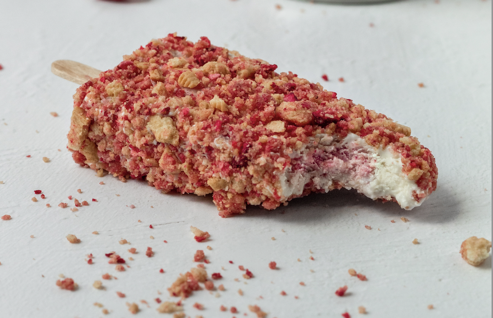 Gently but firmly press each side of the ice cream bar into the strawberry cookie mixture, coating the entire bar.